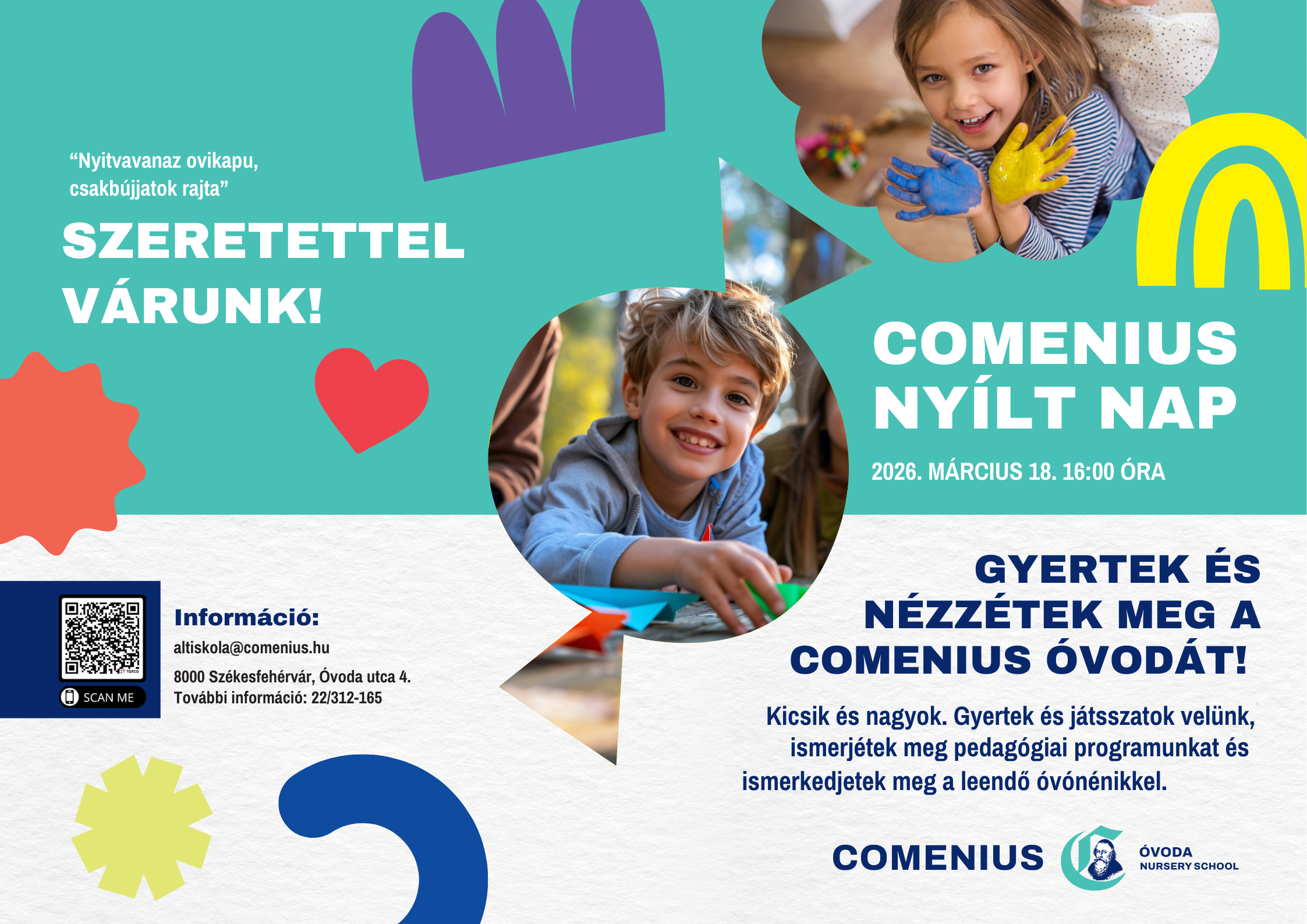 A Comenius Óvoda 3–6 éves gyermekek számára biztosít szeretetteljes, családias légkört, ahol a nevelés középpontjában a gyermek személyisége, egyéni fejlődési üteme és belső motivációja áll. Programunk a Montessori pedagógia elveire épül, ötvözve a korszerű óvodapedagógiai módszerekkel és a kétnyelvű (magyar–angol) neveléssel. Intézményünkben a csoportlétszám maximum 18 fő, amely tudatos szakmai döntés eredménye. Ez biztosítja, hogy pedagógusaink minden gyermekre egyéni figyelmet fordíthassanak, személyes kapcsolatot építsenek velük, és valóban minőségi, elmélyült időt töltsenek együtt. A szakmailag kiváló, elhivatott óvodapedagógusok munkája során van lehetőség a biztonságos kötődés kialakítására és az egyéni szükségletek felismerésére.